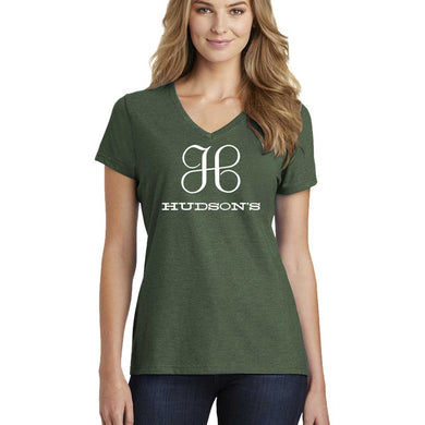 Ladies Relaxed V-neck Detroit Hudson's T-shirt - Heather Forest Green