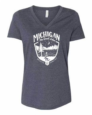 Ladies Relaxed V-neck Michigan Shield T-shirt - Heather Navy