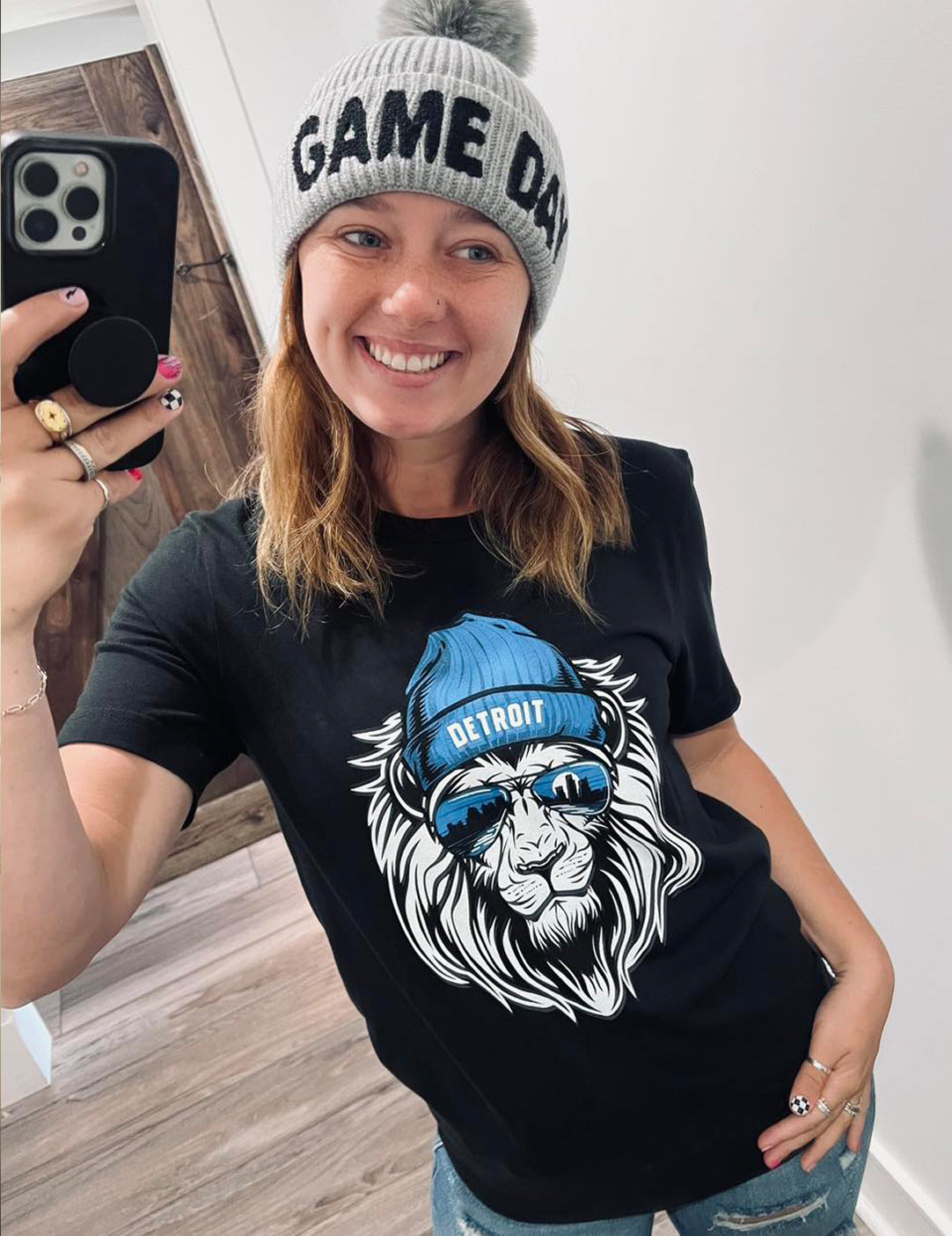 Roaring with team spirit, this shirt boasts a fierce lion head design that's as bold as your game-day passion. Crafted for champions, wear it with pride and conquer the style game – because every fan deserves a shirt as fierce as their team. GO LIONS!